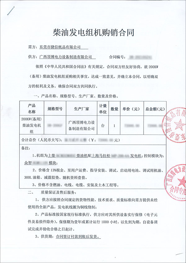 2021年5月24日,廣西頂博電力設(shè)備制造有限公司與東莞市捷信紙品有限公司成功簽訂一臺200kw上柴柴油發(fā)電機(jī)組,該臺機(jī)組將作為備用電源,在市電停電時能迅速為貴公司提供穩(wěn)定的交流電源,保證生產(chǎn)工作不受影響。