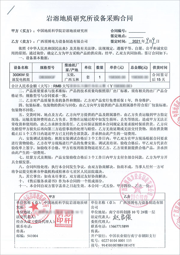 2021年9月9日,廣西頂博電力設(shè)備制造有限公司再度傳來捷報,中國地質(zhì)科學(xué)院巖溶地質(zhì)研究所成功訂購一臺300KW玉柴柴油發(fā)電機組,機組配置為玉柴YC6MJ系列柴油機配上海斯坦福發(fā)電機及眾智控制模塊,機組具有大扭矩、高可靠、低油耗、低排放、低噪聲、適配性強等特點。