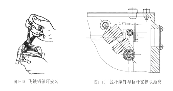 5)裝配調(diào)速器的兩飛鐵時(shí),注意飛鐵銷兩端的銷環(huán)裝上后,應(yīng)用鯉魚鉗緊夾一下,如圖1-12所示,避免產(chǎn)生飛鐵銷脫落而飛出的危險(xiǎn),裝好后旋轉(zhuǎn)時(shí),飛鐵應(yīng)能借其自身的離心力繞飛鐵銷擺,不準(zhǔn)有任何卡住、阻滯現(xiàn)象。