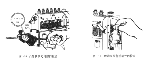 4)安裝灞油泵凸輪軸后,應(yīng)檢查凸輪軸的軸向間隙,其值為0.03~0.15mm,檢查方法如圖1-10所示,如達(dá)不到可用墊片調(diào)整,但兩端加入墊片的厚度要求相等,以保證凸輪軸置于中間位置,間隙調(diào)整好后,轉(zhuǎn)動(dòng)凸輪軸,逐次使每缸凸輪在上止點(diǎn)時(shí)拉動(dòng)灞油泵齒桿應(yīng)活動(dòng)無阻,如圖1-11所示。