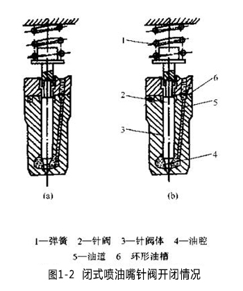 閉式噴油器的工作原理如1-2所示,來自噴油泵的高壓柴油經(jīng)噴油器體與針閥體內(nèi)的油道進(jìn)入油腔,由于噴孔被針閥關(guān)閉,腔內(nèi)柴油壓力便迅速上升。當(dāng)作用在針閥承壓錐面上的柴油壓力大于調(diào)壓彈簧的彈力時(shí),針閥便沿軸向升起,噴孔被打開,于是高壓柴油通過噴孔開始噴入燃燒室。由于噴孔的節(jié)流作用,被噴出的柴油形成霧狀的細(xì)小顆粒,與空氣迅速開成可燃混合氣。這一噴油過程一直延續(xù)到噴油泵停止供油,并在噴油器腔內(nèi)油壓低于調(diào)壓彈簧彈力時(shí),針閥在調(diào)壓彈簧作用下立即關(guān)閉噴孔,噴油才停止。