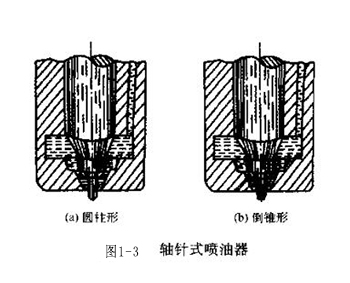 軸針式噴油器的特點(diǎn)是單孔,孔徑較大,一般為1~3mm。針閥端頭有一定形狀的銷針(軸針),插入噴孔中,與噴孔構(gòu)成一個(gè)很小的環(huán)狀間隙(約為0.013~0.025mm ),高壓柴油通過此間隙噴出。軸針的形狀有圓柱形和倒錐形,如圖1-3所示。噴出的柴油根據(jù)不同的軸針形狀產(chǎn)生不同的噴霧狀況。這種噴油器的優(yōu)點(diǎn)是:軸針在噴孔中上下運(yùn)動(dòng),既能改善噴霧,又能自行清除積炭,使噴孔不易堵塞,提高了柴油發(fā)電機(jī)組的工作可性。