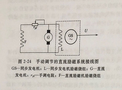 這是交流同步發(fā)電機(jī)采用的傳統(tǒng)助磁系統(tǒng)。直流勵(lì)磁機(jī)一般又有同軸式和背包式兩種形式,如圖2-24所示為手動(dòng)調(diào)節(jié)的直流勵(lì)磁系統(tǒng)接線圖,勵(lì)磁機(jī)為并勵(lì)直流發(fā)電機(jī),通過手動(dòng)調(diào)節(jié)磁場(chǎng)變阻器,改變勵(lì)磁機(jī)的輸出電壓,以調(diào)節(jié)同步發(fā)電機(jī)勵(lì)磁繞組中的電流,從而改變同步發(fā)電機(jī)的輸出電壓。