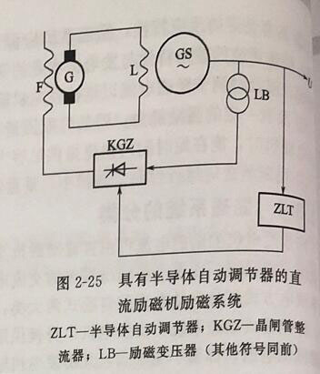 如圖2-25所示為具有半導(dǎo)體自動(dòng)調(diào)節(jié)器的直流勵(lì)磁機(jī)勵(lì)磁系統(tǒng)。自動(dòng)工作時(shí),同步發(fā)電機(jī)的勵(lì)磁電流由自動(dòng)調(diào)節(jié)器按同步發(fā)電機(jī)運(yùn)行情況自動(dòng)調(diào)節(jié),調(diào)節(jié)信號(hào)由同步發(fā)電機(jī)的輸出端取得。過去在直流勵(lì)磁機(jī)的勵(lì)磁回路中串入碳阻式調(diào)節(jié)器代替手調(diào)電阻,現(xiàn)在已被晶閘管半導(dǎo)體自動(dòng)調(diào)節(jié)器所代替。