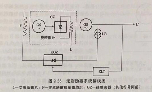 上述③、④兩種方式,硅整流元件和交流勵(lì)磁機(jī)電樞與主軸一同旋轉(zhuǎn),直接給主機(jī)轉(zhuǎn)子勵(lì)磁繞組供勵(lì)磁電流,不但取消了直流勵(lì)磁機(jī)系統(tǒng)中的換向器-電刷結(jié)構(gòu),而且取消了與朝步發(fā)電機(jī)勵(lì)磁繞組相連的集電環(huán)-電刷結(jié)構(gòu),故稱為無刷勵(lì)磁(又稱無觸點(diǎn)勵(lì)磁或旋轉(zhuǎn)半導(dǎo)體勵(lì)磁)方式。交流勵(lì)磁機(jī)的勵(lì)磁繞組固定不動(dòng),其接線如圖2-26所示。有的發(fā)電機(jī)在定子上設(shè)置一個(gè)沒有勵(lì)磁繞組的磁極,它是用優(yōu)質(zhì)的永磁材料制成,作為初始磁場(chǎng)起勵(lì)建壓。